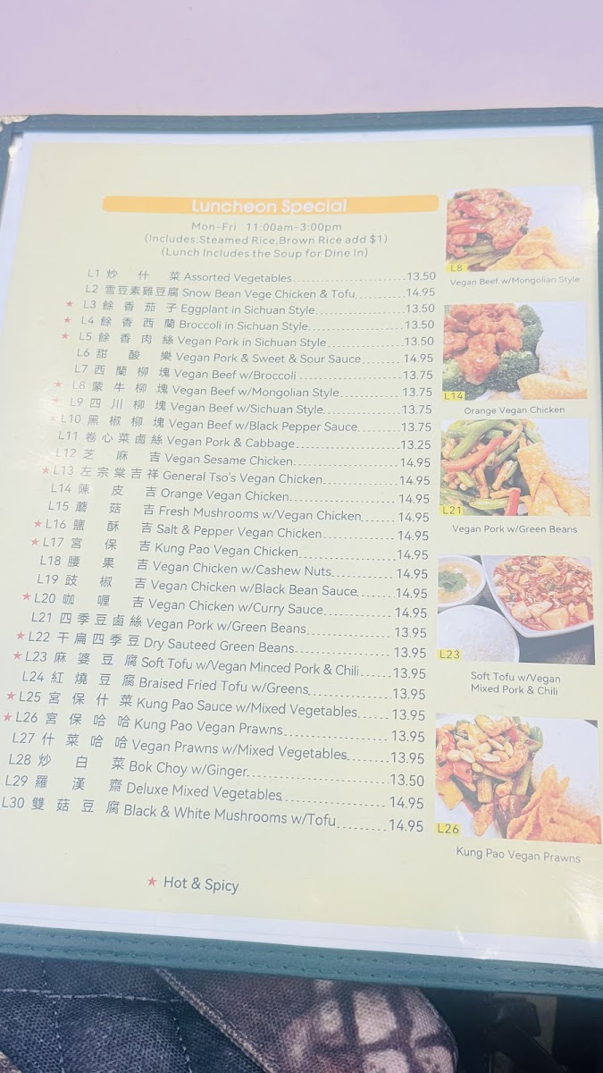 Vegan pork paired with crisp green beans. Option of brown or steamed rice.